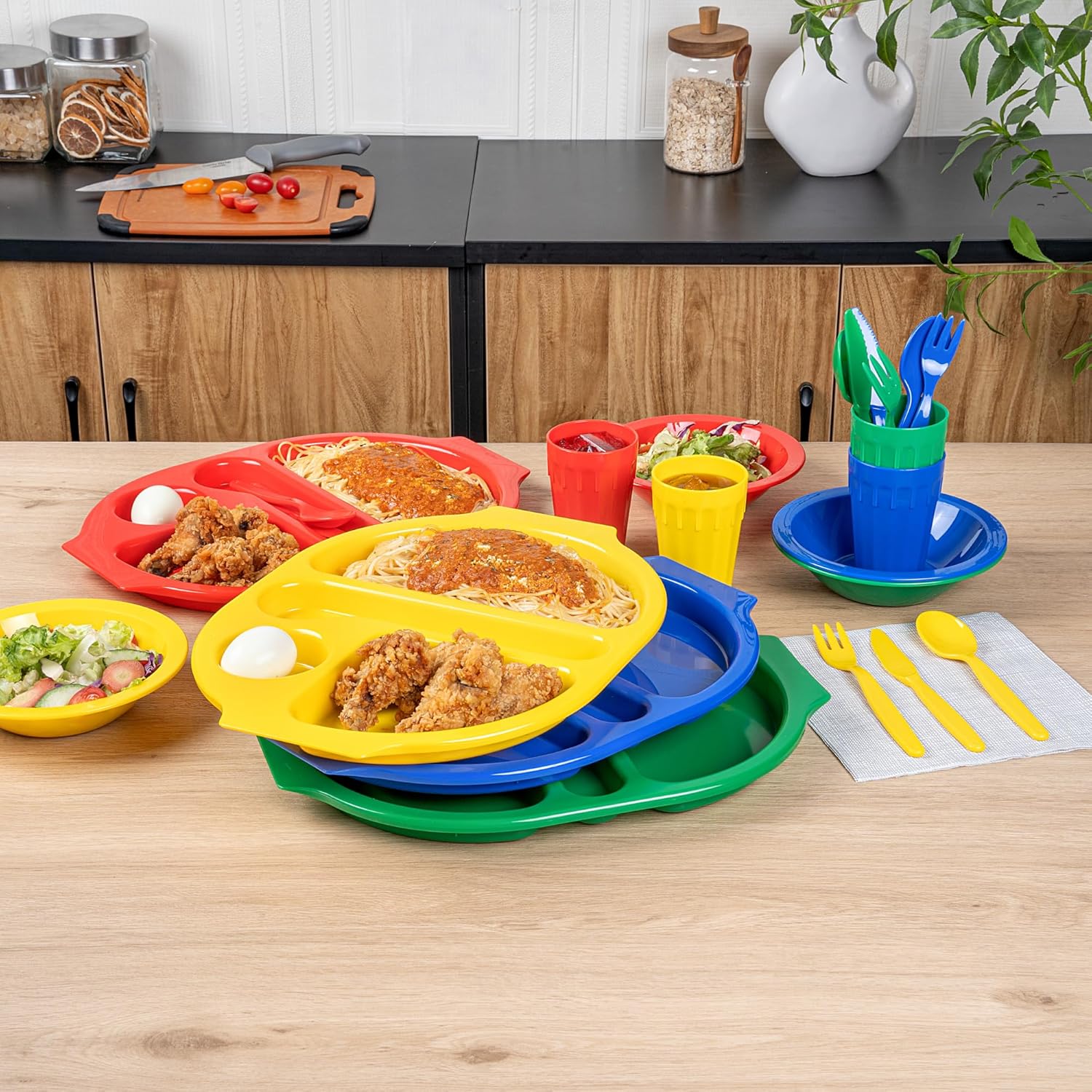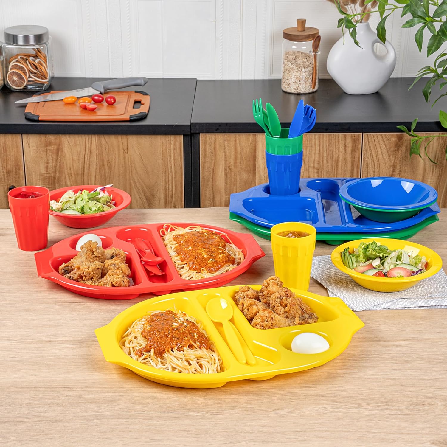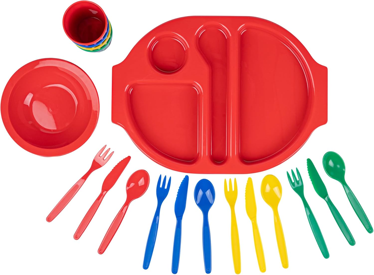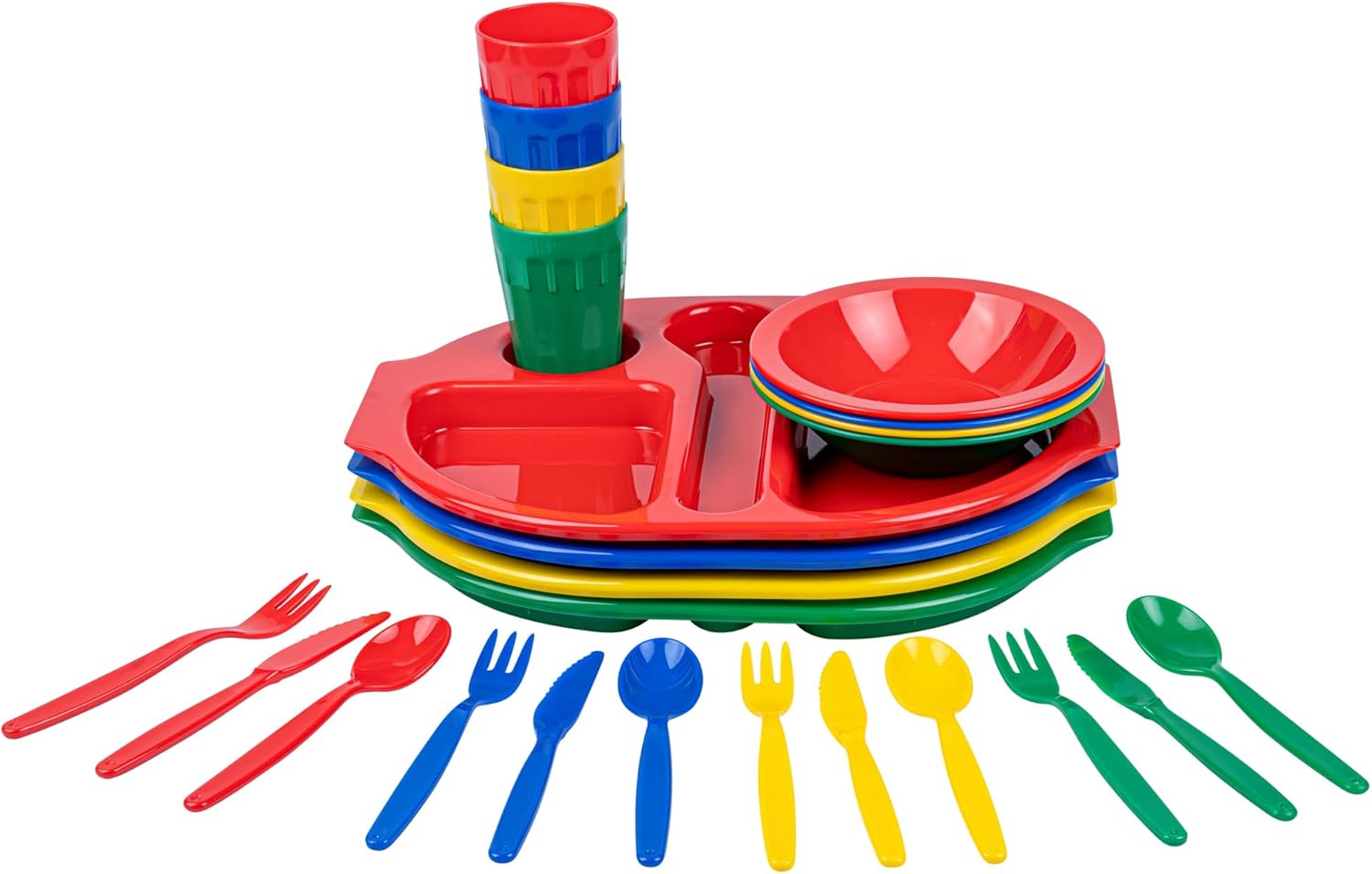 Accelerate meal service with versatile dinnerware. The Plastic Dinnerware Set is crafted from plastic, ensuring every meal is safe by eliminating harmful chemicals. This dinnerware set features a microwaveable design that allows practitioners in foodservice to efficiently reheat meals, providing quick service to bustling family-friendly restaurants. With its stackable feature, this plastic dinnerware optimizes storage space, making it ideal for compact kitchens. This 24-piece dinnerware set includes 4 knives, 4 forks, and 4 spoons, measuring 7 inches in length, 4 tumblers with a capacity of 9 ounces, 4 bowls with a diameter of 6.75 inches and a capacity of 14 ounces, and 4 trays measuring 14.75 inches in length by 11 inches in width. Sold in a 1 count box.