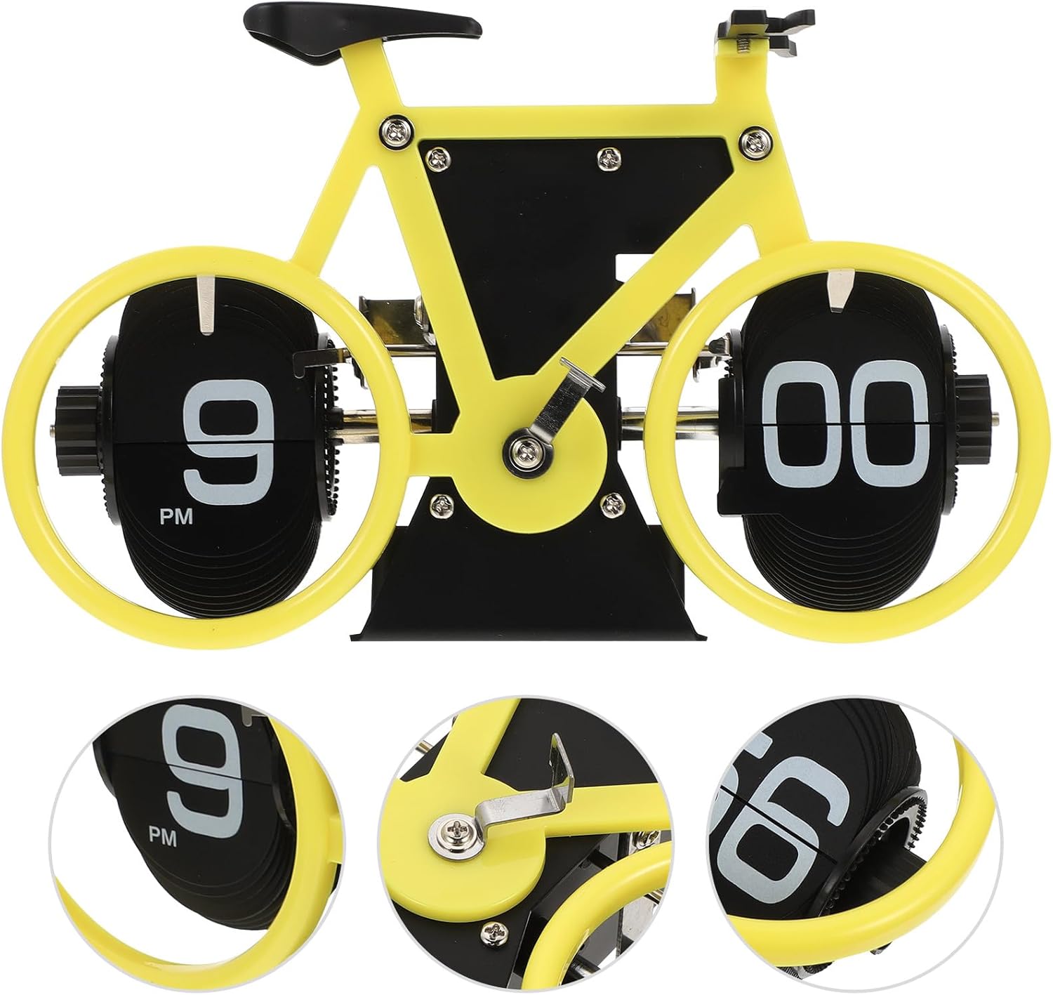 Package Include 1 clock Features -Size:20.00X12.50X7.00cm/7.86X4.91X2.75in -Color:Yellow -Material:ABS, metal, PVC -Note: The clock is powered by 2 AA batteries. (Not Included) small decorative clock -Product Info:Bicycle page turn clock - Adopted with and good craftsmanship, sturdy and practical for a long using. - You can place this decorative clock on a bookshelf, desk, or anywhere you see fit to draw attention to it electronic flip clock. - Vintage bicycle clock can be used in offices, desktops, living rooms, study rooms, and other places you need vintage flip page clock. - This vintage bicycle flip clock is a perfect birthday gifts for your , they will like this desktop clock decoration. - This vintage bicycle ornament has lifelike appearance and can play a good decorative role clock vintage.Goods Descriptionvintage bicycle Wide application, the bicycle flip clock is suitable for living room, bedroom, study room, office, school, and so on.retro clock Designed into a bicycle shape appearance, the flip clock is vintage, and can be used as a desktop bicycle statue decor.digital flip desk clock With compact size, the clock will not take much of the desktop space, and with reasonable structure, the clock is not easy to overturn