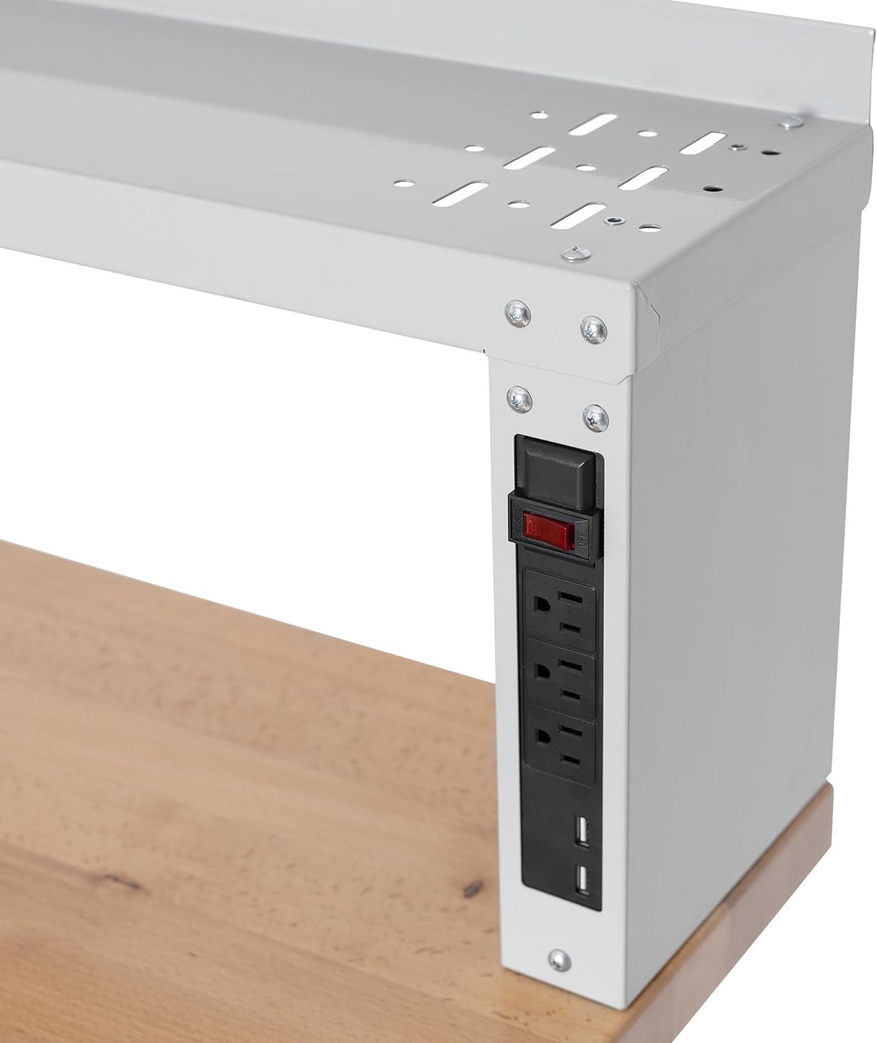 Assembled Dimensions: 48" W x 24" D x 28" to 42" H Dual motors allow seamless height adjustable range from 28" to 42" H with 9.5 feet power cord Polyurethane coated 1.5” thick solid wood top Removable tool rack top shelf: 48" W x 8" D Commercial-grade steel frame Digital display controller allows 3 built in memory saving settings 3 outlet power-strip with 2 USB-A ports and 5.5 feet power cord 4 adjustable leveling feet Total weight capacity: 264 lb. Net Weight: 120 lb.