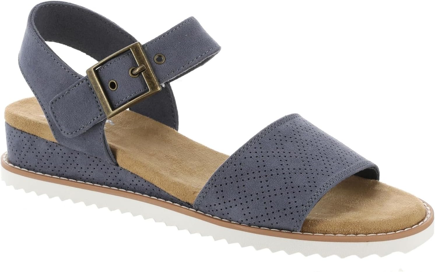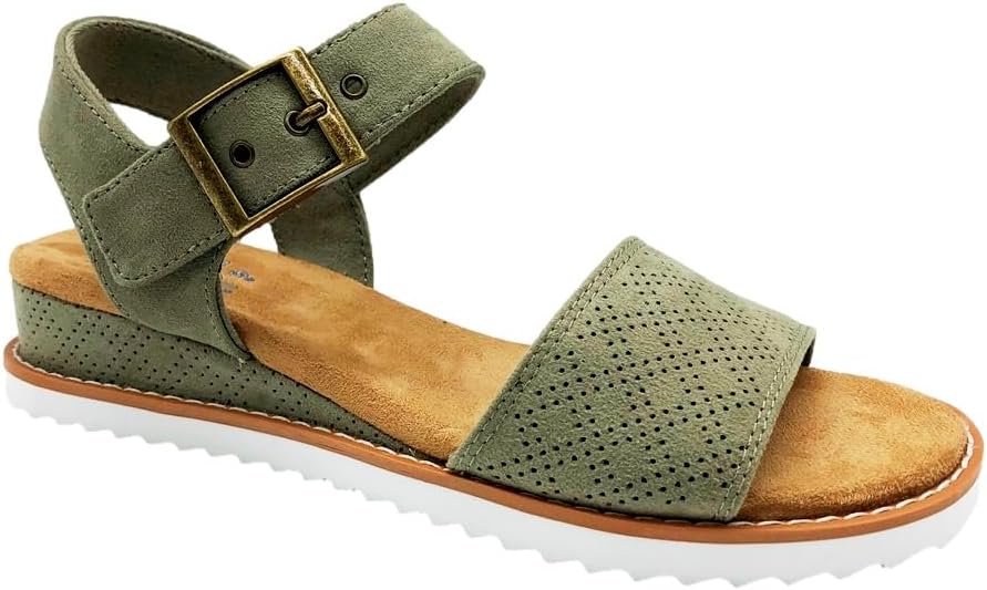 Step into style and comfort with these BOBS Desert Kiss sandals featuring a fashionable wedge design. Perfect for warm weather, these bobs womens sandals combine vegan faux suede construction with perforated detailing for breathability. The espadrille-style wedge and memory foam footbed deliver all-day comfort, while the buckled ankle strap ensures a secure fit. These bobs women shoes blend casual elegance with practical features like a flexible sawtooth traction outsole and machine washable convenience.