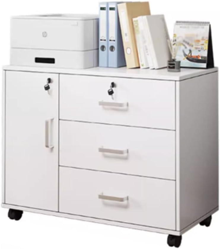 Drawer File Cabinet:I researched for days to find a file cabinet like this that would fit under my desk at work. It arrived as promised in excellent condition without any dents or scratches. All the parts were present including the keys and assembly was nothing more than putting the wheels on. : 1. file cabinet designed to fit under most tables and desks 2. This filing cabinet with open storage spaces, file drawers and storage cabinet is designed to keep the office machines, paper, files and suppliers organized. 3. Spacious desktop can hold your printer or scanner, while open storage shelves can easily isolate the space according to your usage. 4. Safety lock design, you can place private valuables. 5. Easy to assemble, we will screw the screw holes in advance, reserve a good space, you only need to do a simple assembly to use. Product name: Modern Mobile File Cabinet Material: Density board Size: 37x37x55cm , 37x37x57cm , 60x37x57cm Whether to assemble: yes Packing list: Modern Mobile File Cabinet x1 (Items not included for display)