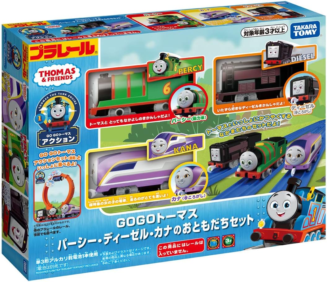 Introducing a car set of characters from the anime Thomas the Tank Engine in the winter of 2022 and 12. This is a set of Thomas animated characters, Percy, Cana, and Diesel vehicles. Connect the percy of the power car to the diesel and drive the Plarail rail to play. Percy's power chassis can be switched between canas and diesel. With 1 power car, this product is sold separately. You can ride through the exciting playland. When it is connected, it will flip around like a whole time. "Exciting Playland" cannot ride around. Set Contents: GOGO Percy Standard version. (Power car) (1), GOGO Cana Standard Version. (1), GOGO Diesel Standard Version. (1).