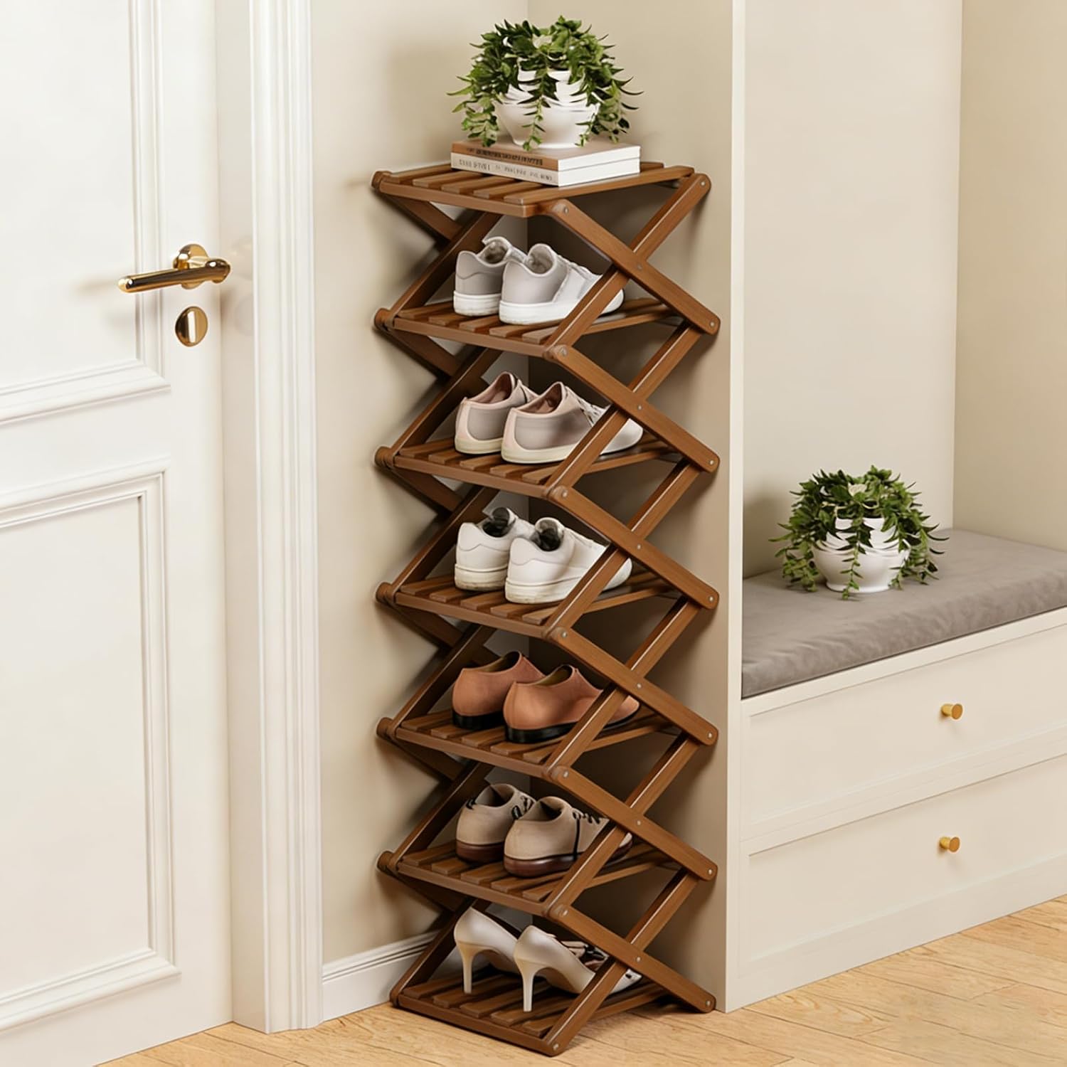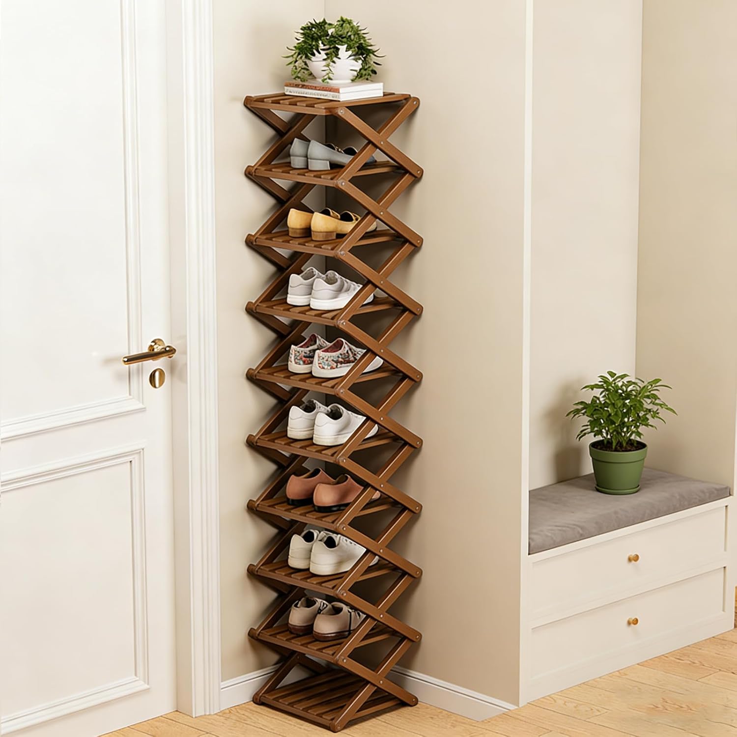 Q: Is it really easy to set up? I hate complicated assembly.A: Yes! It literally takes seconds. Just unfold it and it's ready to use—no tools, screws, or confusing instructions needed.Q: Is it sturdy? Will it wobble or collapse when full?A: It's very sturdy. The reinforced X-frame design and solid bamboo construction provide excellent stability, even when fully loaded with shoes.Q: How many pairs of shoes can it actually hold?A: It comfortably holds 14+ pairs of shoes, depending on their size. The 9-tier design offers plenty of organized space.Q: Is the bamboo treated? Will it get damaged in a humid bathroom?A: It has a smooth finish, but we recommend keeping it in dry areas. For long-term durability, it's best used in hallways, bedrooms, or closets, not in high-humidity spaces.Features:1.Opens in seconds, requires zero tools or assembly2.Maximizes vertical space in tight corners and narrow hallways3.Made of sturdy bamboo with strong load-bearing X-frame4.Holds over 14 pairs of shoes, also great for books and decor5.Folds completely flat for easy moving and compact storageSpecifications:Product Name: The 9-Tier No-Assembly Bamboo RackMaterial: BambooDimensions: As shown in the imageNumber of Tiers: 3/5/7/9/10Color: Natural wood color/BrownPackage included:1 Pc * The 9-Tier No-Assembly Bamboo RackNote:1.Please allow slight dimens error due to manual measurement.Thank you for your understanding2.Due to different monitors and different lighting, the picture May not show the actual color of the item. Thank you for your understanding