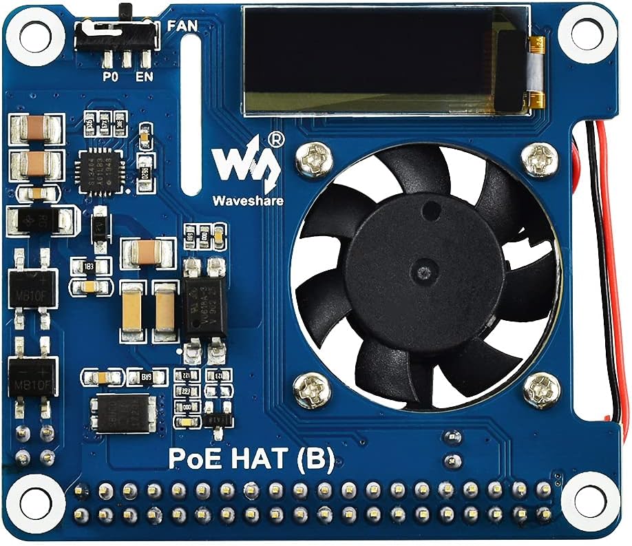 Product OverviewThe Raspberry Pi PoE+ HAT is a Power Over Ethernet (PoE+) accessory for the Raspberry Pi 3B+/4B.Compared to its predecessor Raspberry Pi PoE HAT,it features better cooling effect,implementing the 802.3af/at standard with 5V DC/4A larger power output,providing enough power for both Raspberry Pi 3B+/4B at max load and other peripherals at the same time.By using this small HAT and some proper 802.3af/at-compliant power sourcing equipments,it is possible to provide both network connection and power supply for your Raspberry Pi in only one Ethernet cable.Features:1)For use with Raspberry Pi 3B+/4B2)Power Over Ethernet:providing both network connection and power supply for your Raspberry Pi in one cable.802.3af/at-compliant,5V DC/4A larger power output.3) Stronger air flow,better cooling:25 x 25mm brushless cooling fan with fan control,delivering 2.2CFM air flow for coolingNew Version PoE+ HAT Specifications:PoE standard:802.3af/atInput voltage:37-57 V DC, Class 4 deviceOutput voltage/current:5V DC/4ACurrent sense:YesTransformer design:PlanarFan:Controllable brushless cooling fan,delivering 2.2 CFM for processor coolingFan size:25 x 25mmFeature:Fully isolated switched-mode power supplyCompatible with:Raspberry Pi 3B+/4BOld Version PoE HAT Specifications:PoE standard:802.3afInput voltage:37-57 V DC, Class 2 deviceOutput voltage/current:5V DC/2ACurrent sense:NoTransformer design:Wire-woundFan:Controllable brushless cooling fanFan size:25 x 25mmFeature:Fully isolated switched-mode power supplyCompatible with:Raspberry Pi 3B+/4BPackage ContentRaspberry Pi PoE+ HAT x1Standoffs pack x1