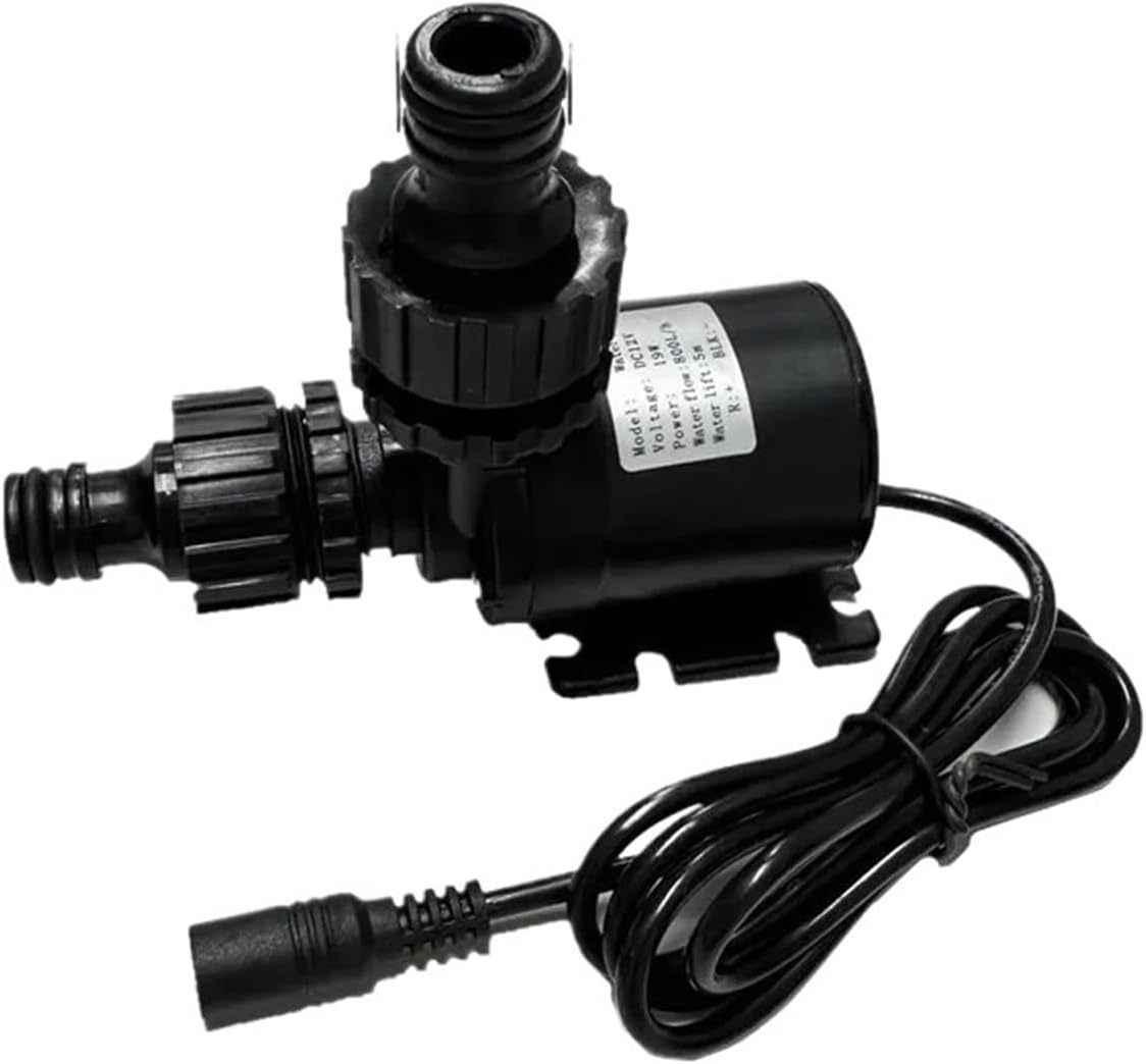 Pumpsusage:Connect the water pump cable (the red wire is the positive pole, don't connect it wrong) to a suitable power source (the battery can be a storage battery or a power converter), then connect the water pipe, and then pump the water pump into the water, and it can be used normally.(Note: The DC brushless water pump is a centrifugal pump. The water flow of the water pump decreases as the head increases. It is forbidden to dive without self-priming function and it is forbidden to be dry.)Specification:Name: Water Pumpmaterial: plasticColour: BlackInlet/Outlet: 1/2" male threadVoltage: 12V DC / 24V DCMaximum rated current: 1000MAPower: 19WMaximum flow rate: 800 liters/hourMaximum water head: 5mMaximum circulating water temperature: 100°CDimensions: Approx. 6.5 cm (D) x 8 cm (H)notes:1. Do not connect the positive and negative poles of the pump incorrectly.2. It is forbidden to connect the water pump directly to the 220V power supply without a power converter.