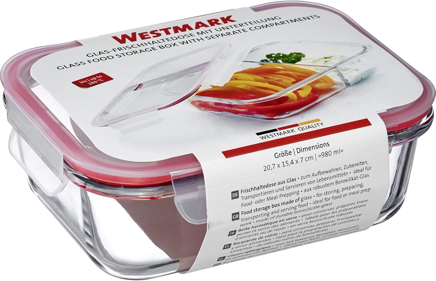 Glass food storage container with two separate compartments, for storing, preparing, transporting and serving food, no mixing of different foods thanks to the fixed divider - Ideal for food or meal prepping, stackable, airtight and freezer safe - Glass microwave and oven safe, note: remove lid beforehand - Easy to clean by hand, glass dishwasher, microwave and oven safe - Without lid, heat resistant from -20 °C to + 280 °C/ - 4 °F to 536 °F, BPA-free. Box contents: 1x Westmark glass food storage container with 2 separate compartments. Dimensions: 20.7 x 15.4 x 7 cm, material: glass/silicone/plastic (PP), colour: transparent/red, 234622E1